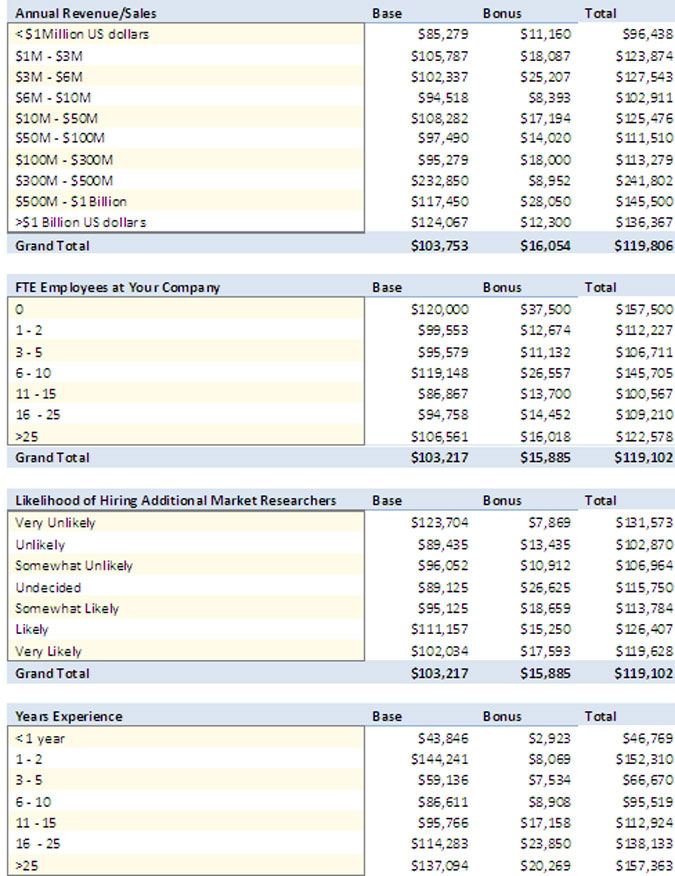 The average total salary by region (including bonuses) was a hefty $25,000 more than client-side researchers, with the greatest salary discrepancy between client- and provider-side being in Asia, where the average vendor earns over $95,000 more than client-side researchers in the same area. Conversely, client-side researchers in Mexico/Central and South America earn over $57,000 more on average than provider-side researchers in the same areas. Aside from these two earning disparities, earnings in the other regions around the world were comparable, with vendors being paid slightly more on the whole.