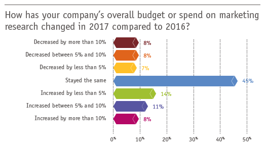 For insights pros, the more things don’t change, the more they stay the same. The wording is tortured but you get the point: As reflected in this iteration of our Corporate Researcher Report work life survey, status quo pretty much sums things up. Whether it’s salary and compensation (see accompanying article) or MR budgets, the responses have been very consistent since we began fielding the annual survey in 2014. For example, nearly 45 percent said their MR budget stayed the same as in 2016 (23 percent reported a decrease and 32 percent reported an increase).