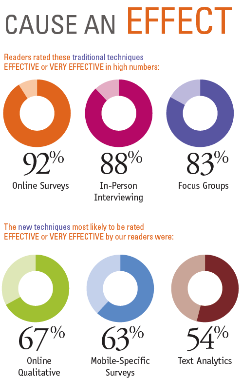 The good-old focus group, that much-maligned and oft-declared dead stalwart, was said by a combined 83 percent to be effective or very effective, with the focus group earning a tie (at 65 percent) with online surveys for the highest percentage of “effective” nods.