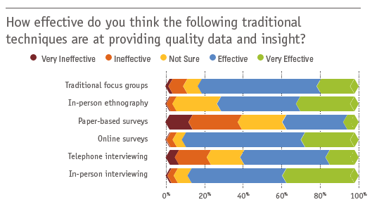 Despite grumbles about sampling elsewhere in their responses, readers gave online surveys the highest combined percentages of effective/very effective, at 92 percent. In-person interviewing (a combined 88 percent effective/very effective) and in-person ethnography (72 percent combined) also did well.