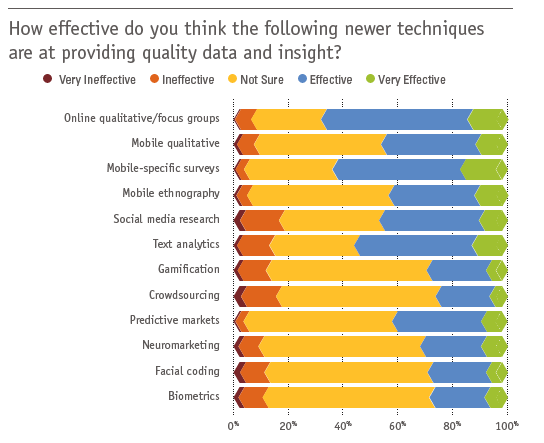 Many of the less-established techniques, such as mobile ethnography, gamification, crowdsourcing, predictive markets, neuromarketing and other nonconscious methods, earned “not sure” percentages of over 50 percent when respondents were asked about their respective levels of effectiveness.