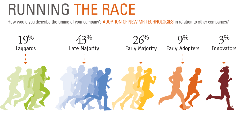 Putting a timeline around the pace of adoption of new tools is rather difficult but we settled on a scale that went from “innovator” on the early side to “slow to adopt (laggard)” on the other end, with the points of “early adopter,” “among the early majority” and “among the late majority” sandwiched in between. Not surprisingly, the bleeding edge is not familiar territory for researchers, with only a combined 12 percent putting themselves in the innovator and early-adopter camps. Instead, “among the late majority” is a more comfortable realm, with 43 percent using that descriptor for their speed of adoption, with “among the early majority” at 26 percent on one side and “slow to adopt (laggard)” on the other.
