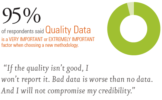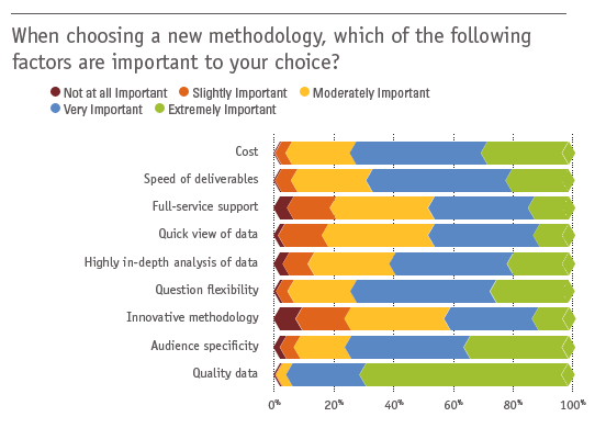 Happily, data quality was the runaway winner as the factor that is most important when choosing a new methodology, with 70 percent citing it as extremely important, followed by audience specificity, cost and question flexibility.