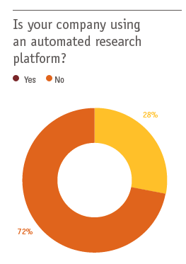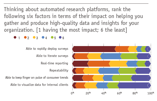 Twenty-eight percent of respondents said their organizations currently use an automation platform. When asked to choose from a list of automation platform capabilities that they feel have the most impact on gathering and producing insights, time-related factors such as rapid survey deployment and real-time reporting were seen as contributing the most.