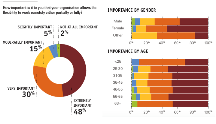 With work from home trending, we asked respondents, “How important is it to you that your organization allows the flexibility to work remotely either partially or fully?” A whopping 78% said this is extremely important or very important. Interestingly, 54% of women said it was extremely important as compared to only 37% of men.