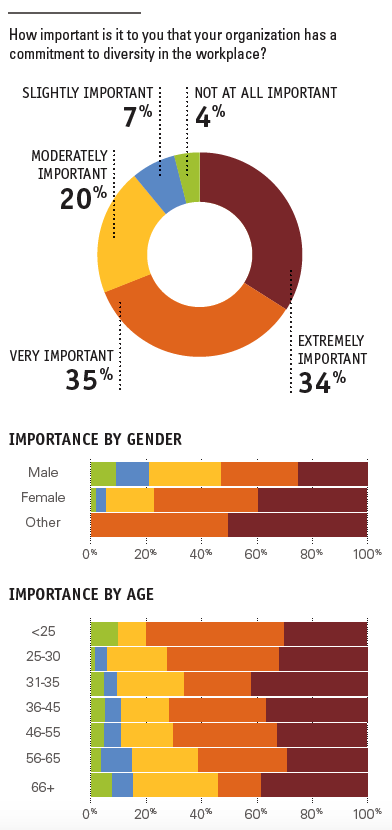 In 2020, like many industries around the world, research and insights put a heavy focus on diversity. When asked, “How important is it to you that your organization has a commitment to diversity in the workplace?” a combined 69% of respondents said extremely important or very important.