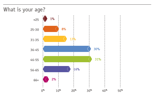 In 2016, we found a larger percentage of employed client-side respondents were women as compared to men, and made note to watch this trend. The 2017 survey showed a very similar breakdown. In both the 2016 and 2017 surveys, for those over age 66, men exceeded women, and for those under the age of 35, women exceeded men by more than 30 percent.