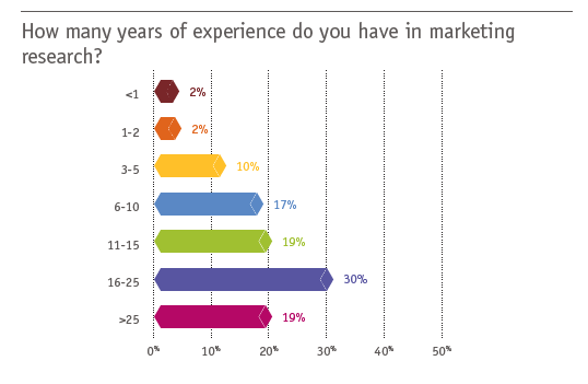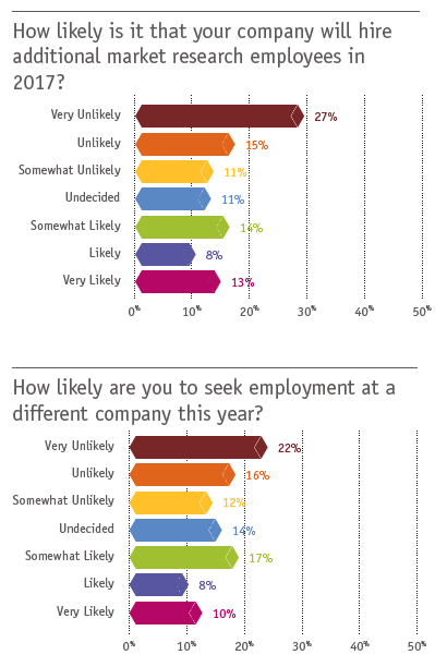 While members of the research industry have gone through rashes of wanting to change jobs, they reminded us again this year that as the grass isn’t always greener on the other side. Only 35 percent of respondents said they are somewhat likely, likely or very likely to look for work at another company this year. This should be good news to job seekers and employees alike, as 35 percent of respondents said it was somewhat likely, likely or very likely that their company would hire additional marketing research employees in 2017.