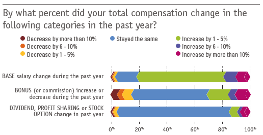 Less than 4 percent of respondents reported a decrease in base salary during the past year and approximately 81 percent saw an increase. As in previous years, we dug into the comments in the compensation section. While some reported the disappointment of stagnant compensation, others shared their excitement of finally obtaining the rewards of years of hard work:
