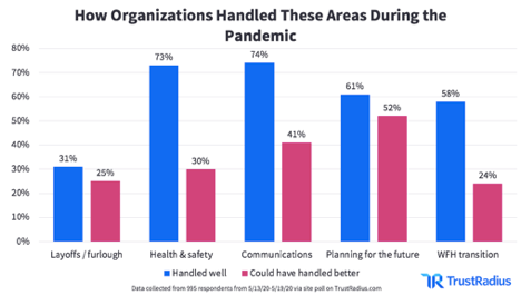 Of the respondents who said their organization had responded to the pandemic poorly, one out of five thought their company could have handled layoffs or furloughs better. On the other hand, of the respondents who said their company had responded to the pandemic well, about three out of four respondents felt their organization had handled decisions about health and safety and communications well.