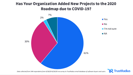 Sixty-one percent of our audience of business professionals said their organization has added new projects to the 2020 roadmap due to impacts from the pandemic. The organizations that responded “no” likely didn’t have the bandwidth or resources to add new projects, since most of their energy was being devoted to keeping their head above water.
