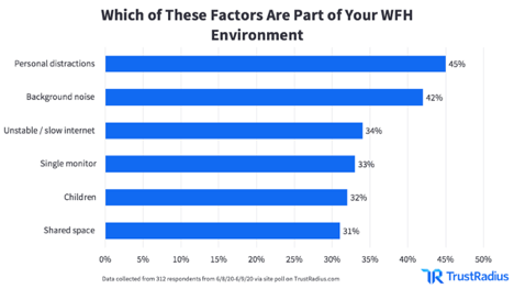 These results are fascinating not only because they help debunk concerns about employee productivity while working from home, but because remote working environments are full of distractions and challenges for many people. Forty-five percent of respondents said they have personal distractions in their WFH space, while 42% have background noise and 32% have children to take care of.