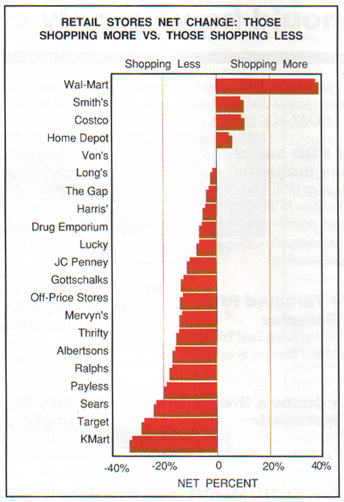 The study's findings are based on 600 telephone interviews with adult females (at least 18 years of age) who had made a shopping trip in the previous seven days. A similar WSL Marketing study on Evansville, Indiana, was featured in the Trade Talk column in the December 1991 issue of Quirk's Marketing Research Review. As with the Evansville study, the Lancaster-Palmdale research studied women's purchasing habits in a range of essential and non-essential products, including clothing, food (fresh, frozen and snack food), greeting cards, and health & beauty aids. Respondents were asked to name the stores they had shopped at in the past week, which stores and brands they had switched to/from, and to answer questions designed to gauge their optimism or pessimism regarding their lives and those of their children.