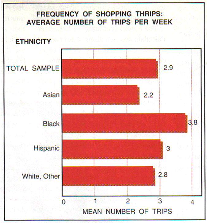 The most striking difference in the types of stores shopped by ethnic group was among Black respondents who were conspicuous for the kinds of stores they did not shop. They were much less likely to shop in discount stores (28%) than Hispanics (51%), Whites (42%) or Asians (38%) and were less likely to have shopped in department stores or warehouse clubs, instead shopping predominantly in supermarkets, averaging 1.7 times per week compared to 1.3 times for Asians, Hispanics, and Whites.