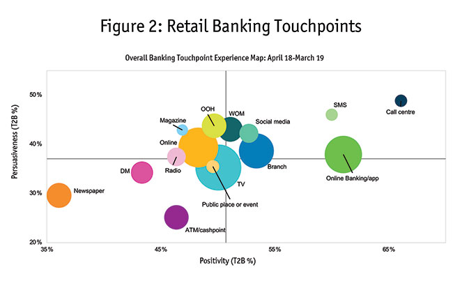 Again, at our firm, we find that these owned touchpoints are extremely important. After the actual usage experience, they are often the most powerful. In Figure 2 we can see the importance of online/banking apps, branches and call centers. A bank’s website is also a powerful touchpoint.