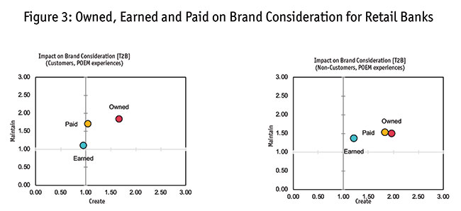 Normally these are proactively sought-out experiences, rather than passively-seen ads, so it should not be surprising that people feel strongly about these type of experiences – either positively or negatively. An emotional reaction to a brand experience is important to its impact. We have found that a positive experience usually has about three times the impact of a neutral one on brand consideration. And in some instances, a neutral experience erodes brand consideration. In Figure 3, for example, when we look at the impact of owned media for banking on brand consideration, we can see how important this is.