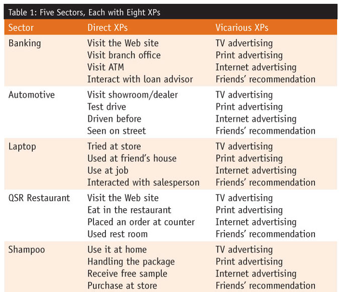 Experience touchpoints play an important part in this architecture; they represent a common language for both loyalty and brand research. As noted earlier, we selected eight XPs for each sector. Vicarious XPs are the same for each sector. The four direct XPs differed based on the idiosyncratic nature of each sector. The XPs for each sector are presented in Table 1. The system described in this research is highly flexible; the XP set may be focused on more direct XPs and therefore be of greater utility to managers interested in enhancing the consumer experience. In contrast, if more emphasis is placed on vicarious XPs, the results will likely have more utility to brand managers and advertising researchers.