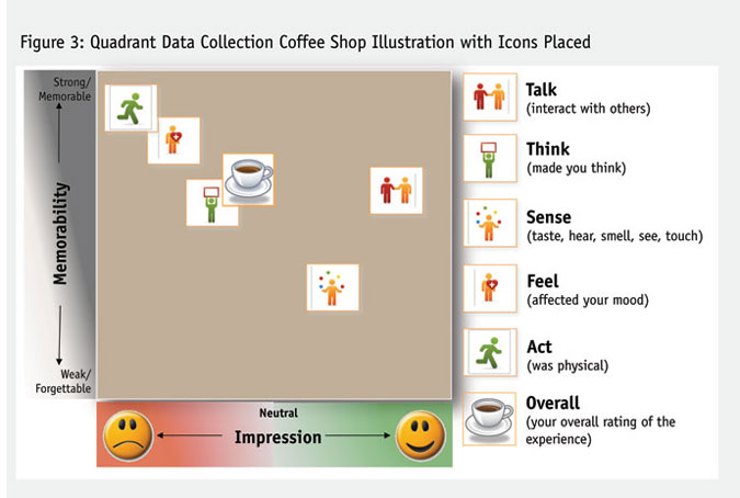 Following the introductions to the icons and quadrant dimensions, respondents were shown an illustration of how a person might place the five experience icons and an overall touchpoint icon with respect to waiting in line to place an order in an upscale coffee shop. In this exercise, respondents were shown how to drag each icon into the quadrant space and place it based on both impression and memorability. After all six icons were placed in this training exercise, a respondent’s efforts would yield the final illustrative result presented in Figure 3. By placing the six icons into the quadrant space a respondent creates 12 scores since each icon has a unique x/y position.