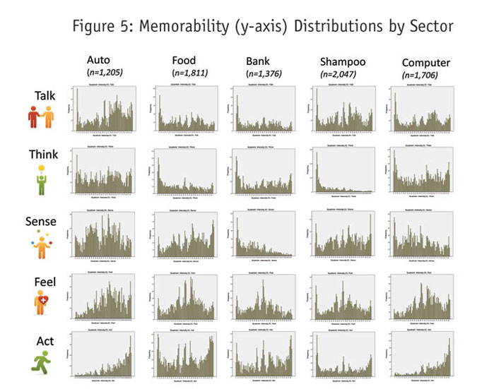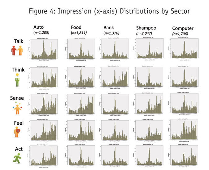 The distributions in Figures 4 and 5 demonstrate interesting differences across the sectors and across the five experiential dimensions. For example, a column-wise review of Figure 4 reveals substantive stability with respect to the x-axis placement of the five icons. However, a parallel examination of Figure 5 suggests considerably more differentiation across the five experiential dimensions (Talk, Think, Sense, Feel, Act). That is, with respect to vertical axis placement within each sector there were strikingly different distributions for each icon, suggesting that the memorability of touchpoint exposure may be a critical dimension that until now, has not received much attention.