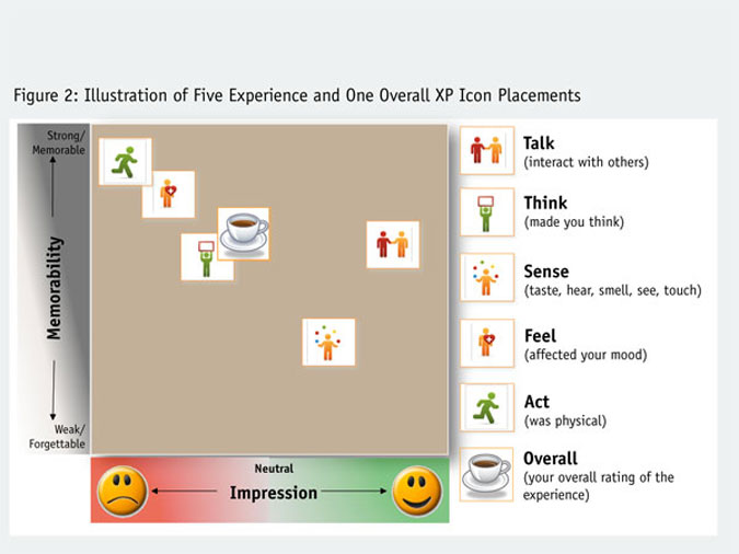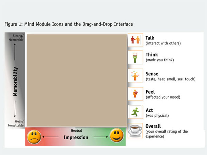 As described in part one of this article, the five modules were translated into consumer-friendly terms and enhanced with graphic icons (Figure 1). Respondents then used the drag-and-drop interface to rate a particular experience point (XP) in terms of the memorability and impression (valence) of each dimension. Finally, a sixth icon representing the overall experience point was also moved into the quadrant space. Prior to engaging in this task, respondents were extensively socialized with the dimensions and quadrant axes.