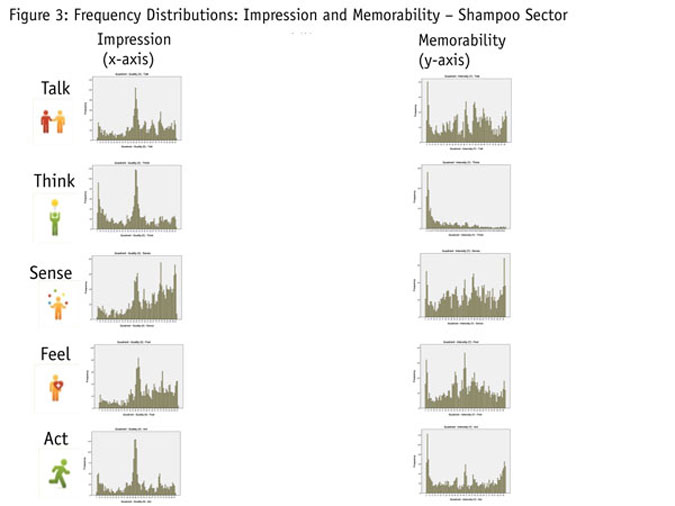 Clearly, the distributions shown in Figure 3 vary depending on the experience dimension and the axis (memorability versus impression). Let’s review the distributions across each of the five experience dimensions. First, the Talk (social) dimension yielded a quasi-normal distribution on the impression axis and a multimodal distribution with respect to memorability. Again, these data are presented at the aggregate level (across all five brands and eight XPs) so it is difficult to ascertain the source of these spikes. The shampoo experience quite clearly was not memorable from a cognitive perspective and actually elicited some negative impressions on the x-axis.
