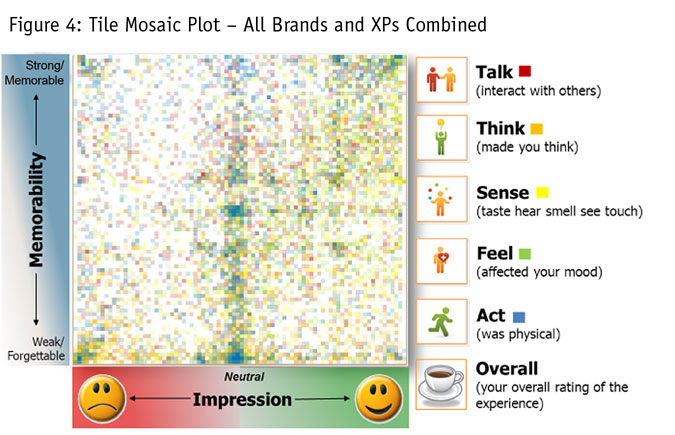 Even seasoned marketing researchers have difficulty re-integrating these two axes into a single x-y plot. To illustrate the unique and flexible nature of these data, our visualization science department created the tile mosaic plot presented in Figure 4. This representation of the data aggregates all five brands and eight XPs. The interactive version of this graphic allows the user to change experience point colors and select data based on a drop-down menu system. This gives users the ability to assess differences by gender, brand, XP, or other relevant data. In the case of Figure 4, the upper-right corner is particularly noteworthy since it represents vivid, positive valence – clearly a desirable location. The tile mosaic graph in Figure 4 is distinctive because of the density of yellow (Sense) and green (Feel) tiles in the upper-right corner. It is quite differentiated in terms of color distributions from other sectors such as automotive, computer or banking.