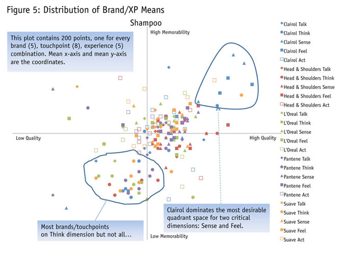 Figure 5 presents a quadrant containing 200 points: the five brands each with eight XPs and five experiential dimensions (Talk, Think, Sense, Feel and Act). Each point represents the average score on the two dimensions. (This is noteworthy because a review of the distributions presented in Figure 3 reveals that in many cases the distributions are far from normal and the mean may be somewhat misleading.) Color is used to highlight the brands and shape illustrates the five experience dimensions. In the interest of clarity, the eight XPs are not further differentiated. As a result, each symbol-color combination is repeated eight times (once for each XP).