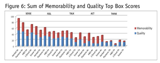 Figure 6 presents another visualization of the shampoo brands aggregated across experience touchpoints. In this case, x- and y-axis coordinates greater than 75 on the 85-point “scales” were counted as top-box and percentages calculated and summed by brand within the five experience dimensions. In nearly every case, there were more top box impression ratings than memorability ratings. In one case (Herbal Essences – Talk) memorability exceeded quality. The highest memorability ratings were associated with Herbal Essences though Pantene was close behind. A return to Figure 5 reveals that Pantene enjoyed a fair number of Sense and Feel (average) ratings in the upper-right of the quadrant.