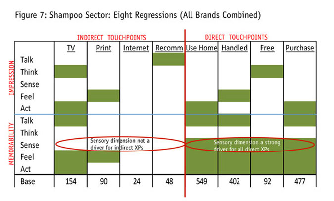 Perhaps of greatest interest is that Sense memorability was a significant driver for all four of the direct XPs but this was not the case with respect to the indirect XPs like TV advertising. In this case, it seems clear that physical interaction with the product is necessary to generate sensorial memorability. Another noteworthy aspect of the data presented in Figure 7 involves the role of the social (Talk) dimension. It is a significant driver for only one of the eight XPs: recommended by a friend.