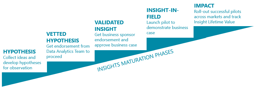 Together with industry experts, we co-created a new operating model “Insights Hub” to mature insights from a raw idea based on data insights into real business impact one bite at a time. Insights Hub is enhancing the data value chain by introducing the capability to mature data insights all the way to actual impact, such as enhanced customer experience and incremental revenue. The simplified data value chain is advanced by insights management to undergo this transformation: