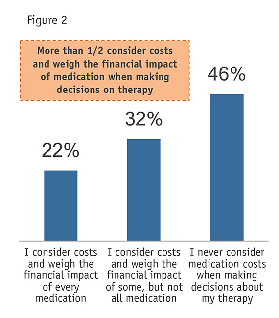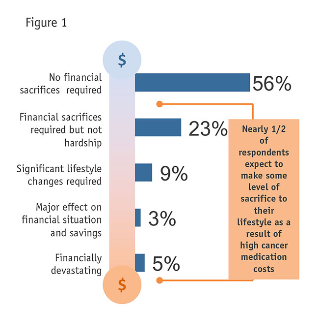 This research shows nearly one of every two cancer patients have had to make lifestyle changes as a result of medication costs (Figure 1). (MarketVision Research, 2015) The sacrifices run the gamut from not being able to fund a retirement account to not being able to pay children’s college tuition, or in some cases, making the decision not to spend $100,000 or more for treatment which promises only to extend life by two additional months.