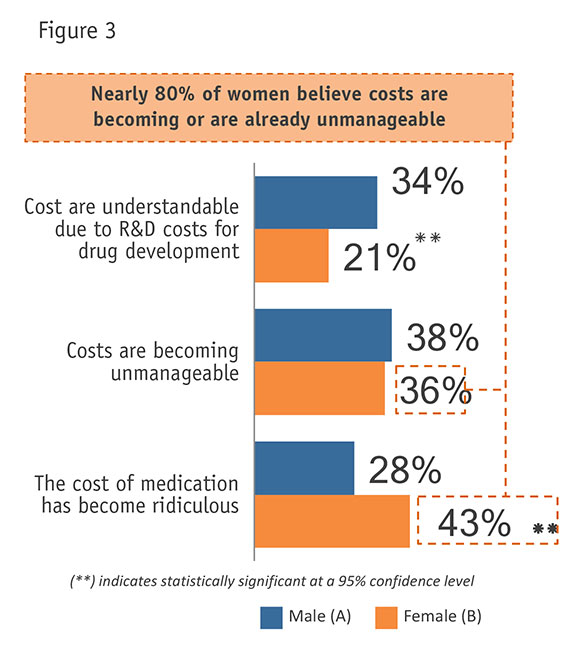 There is a high level of anxiety associated with costs and the financial distress alone can impact a patient’s health. As referred to by some as “financial toxicity,” the increased burden of costs itself becomes a factor influencing a patient’s health, either through treatment decisions that don’t provide the highest quality of care or financial sacrifices that lower quality of life. Research suggests this toxicity may be linked to greater mortality. (Oxford Journal, November 2015) Not surprisingly, patients at lower income levels tend to be impacted more than other groups. In addition, females show a much greater level of concern about the medication and treatment costs than men (Figure 3) and tend to take more action in understanding the options. This response is more pronounced among younger patients and those whose length of therapy is less than one year.