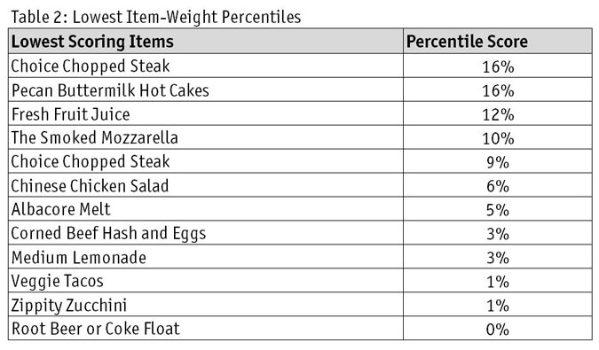 We reported the percentiles to the Johnny's management team. The initial report, given that Johnny's wants to cut items from the menu, shows the bottom 12 items by item-weight percentile (Table 2).