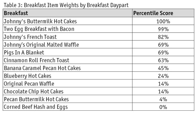 The production of percentiles for item weights is also very flexible. Johnny's asked us to filter the item weights by only those who visited the restaurant for breakfast. Moreover, they would like to see only breakfast items in the percentile chart. Table 3 shows the percentile output of this filtered request.