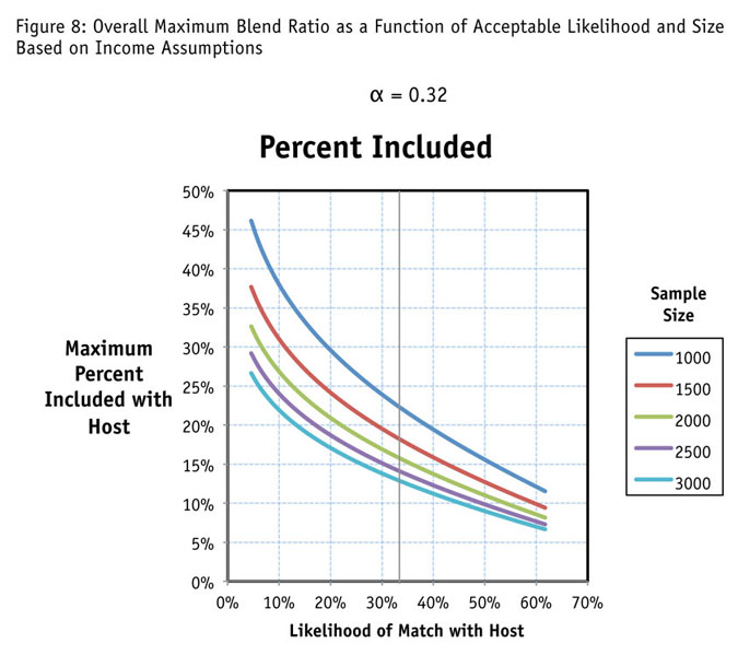 We have chosen the targeted sample size to be 1,500 and used an a = 32 percent or one standard error. This corresponds to what we believe to be reasonable conditions for a typical mixed-source application. In the case of VOP and Peanut Labs, this allows an average maximum blending ratio of 18 percent, covering all demographic cells, though in reality the specific percentage will differ between the cells. Increasing the tolerance would result in a larger maximum blending ratio, as well as the reverse, should more conservative estimates be desired.