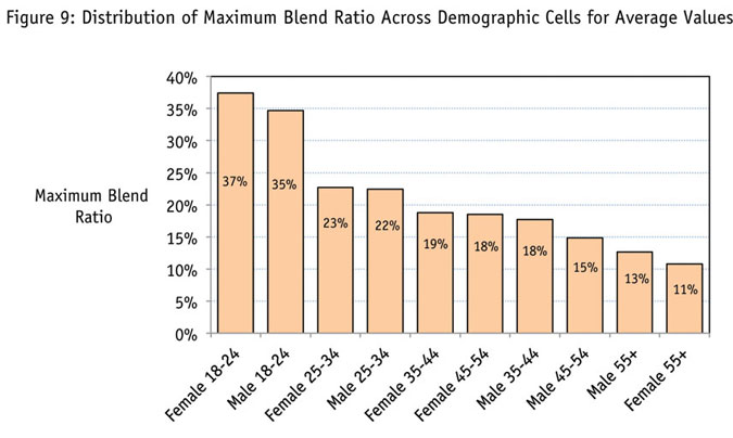 Figure 9 shows the distribution of maximum blend ratios across the demographic cells using averaged values. It ranges from 11 percent for the female 55+ to a high of 37 percent for the female 18-24.