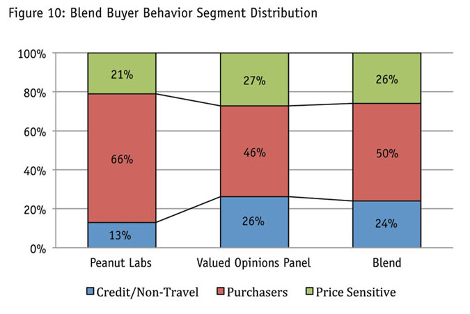 Figures 10-12 show the effect of the blending process based on the three main segmentions. It is expected that there should not be any major differences between Valued Opinions Panel, and the blend, even though 18.8 percent of the blend is respondents from Peanut Labs. Figure 10 shows the results for the buyer behavior segments. While there are differences between the host and the blend, they are relatively minor.