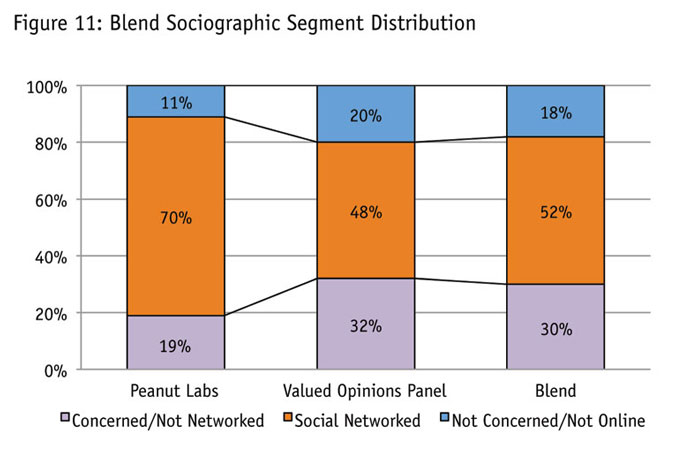 Figure 11 shows similar results for the sociographic segments. Clearly, as previously noted, Valued Opinions Panel and Peanut Labs are very different. But the blend is very close to that of the original panel. The blend and Peanut Labs sample sets were significantly different at p<.01.