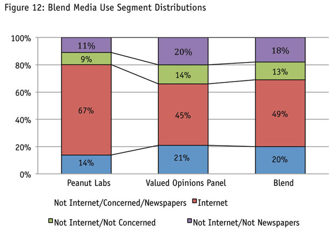 Figure 12 shows the results for the media usage segments with the same conclusions. The differences between the blend and the host are minor compared to that against the total for Peanut Labs. It is this similarity of characteristics that allows for the blend to be used as an extension of the original panel without major concern regarding consistency. The blend and Peanut Labs samples continued to be significantly different.