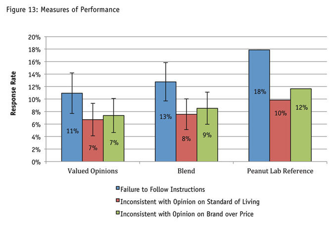 Figure 13 shows the results for performance, a measure of respondents’ susceptibility to “trap” questions, through which respondents’ engagement in the survey is tested. Three such questions were used. First, an instructional question where respondents were asked to enter a certain value. Those who entered an incorrect value received a mark for “failure to follow instructions.” Two other questions asked logically-identical but oppositely-worded questions regarding their quality of life and their preference for brand over price. An attentive respondent should give opposite answers to these questions and those who did not were coded as being “inconsistent.” As shown by the root mean squared error (RMSE) statistic, the blended sample was not significantly different from VOP in any measure of performance but was significantly different from the source sample set in all cases except “standard of living.”