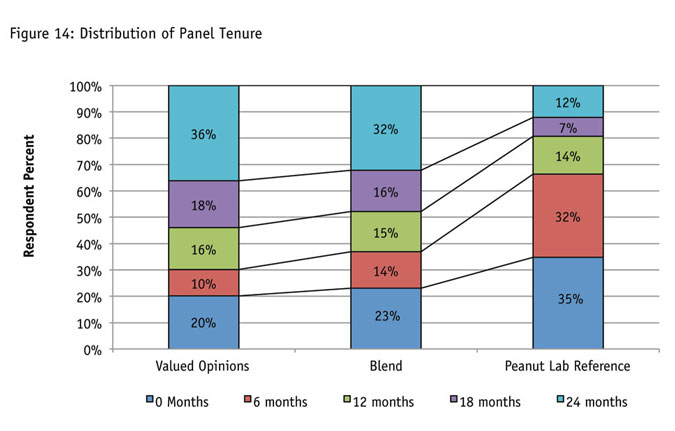 There is evidence that changes in panel members’ tenure can cause shifts in data. In Figure 14, the comparison between the aging of panel participation distributions for blend, VOP and the Peanut Labs reference is shown.