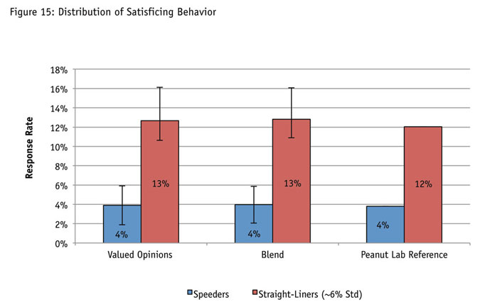 The performance characteristics that were covered previously focused on the errors made by respondents and their tenure on panels. There is a third category of activities that are thought to possibly affect the quality of results. These are the participants who either speed through the survey (speeders) and those who give similar or identical values to blocks of questions in the surveys (straightliners). These respondents can be viewed as potential satisficers. In Figure 15, the distribution of satisficing behavior is shown. Based on the RMSE, the number of straightliners and speeders in the blended sample was not significantly different from VOP or Peanut Labs.