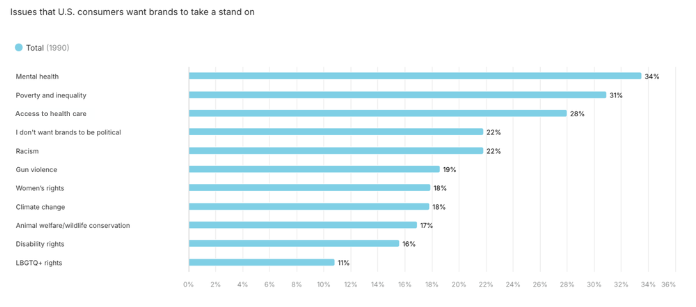 While mental health has historically been regarded as a private issue, it now ranks first as the topic consumers most want brands to take a stand on (34%). That places it above climate change (18%) and racism (22%) – two issues that often dominate brand-led social responsibility initiatives. A related issue, access to health care, is the third most important advocacy issue (28%).