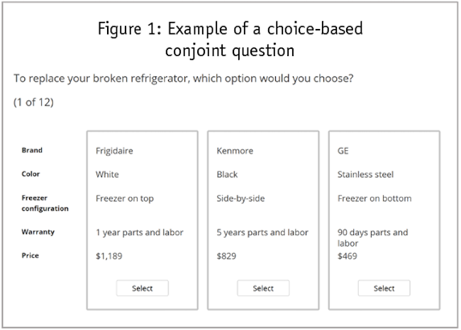If we add experimental control in the design of stimuli, we have a choice experiment. The most familiar of these features multi-profile choice sets analyzed via conditional MNL, a combination known as choice-based conjoint (CBC), discrete choice experiments or stated choice experiments (Louviere and Woodworth 1983). In a choice-based conjoint experiment, we show each respondent a series of a dozen or so questions that look like the one shown in Figure 1.