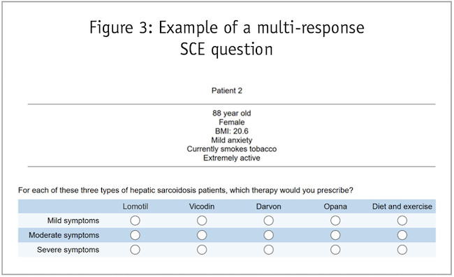 The patient-type experiments such as the hepatic sarcoidosis example above are the most common application of SCE. These have small numbers of attributes, typically four to eight, and also small sample sizes. The populations from which we draw physician respondents come are small and they expect expensive honoraria for their participation in survey research.