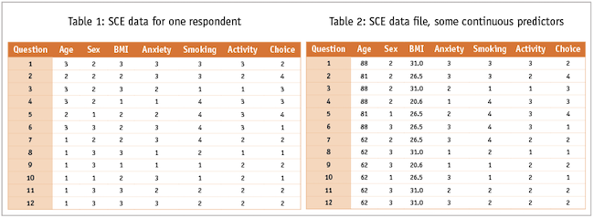 To create our analysis data file we simply concatenate the 12 rows of data we get from each respondent; in this example where each respondent makes choices for each of 12 patients, our analysis data file would contain 12 times as many rows as we have respondents.