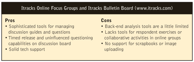 This Canadian company actually offers four different software applications for Web-based qualitative research, as well as tools for quantitative data collection. In this review, we will concentrate on the two more established qualitative products: Itracks Online Focus Groups (OFG), for real-time interactive focus groups, where all participants are online simultaneously; and Itracks Bulletin Board (BB), where questions are posed and answered asynchronously, usually over several days.