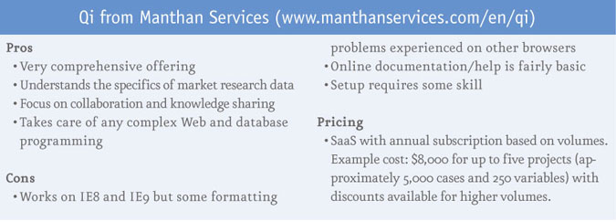 Manthan Services, an India-based developer, noticed the opportunity to build on the dashboard and business information systems it was providing corporate customers and developed a research-friendly package called Qi (as in “chi” or energy). An online platform for creating advanced dashboards based on survey data, Qi delivers an online environment for data exploration, review and collaboration. It is a tool for building dashboards and an environment in which end-users can then access those dashboards, share, collaborate and even, if allowed to, create their own analyses and dashboards.