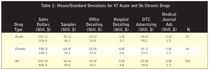 The means and standard deviations for the dependent measure sales and the five predictor variables used in the multiple regressions appear in Table 1. As might be expected, chronic drugs generate higher sales and have larger promotional expenditures on average in every category compared to acute drugs.