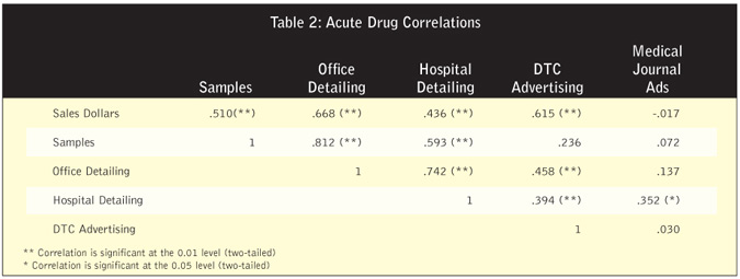 As can be seen in Table 2, with the exception of journal ads, the correlations among sales dollars and the promotional mix variables are significant across the board for acute drugs.